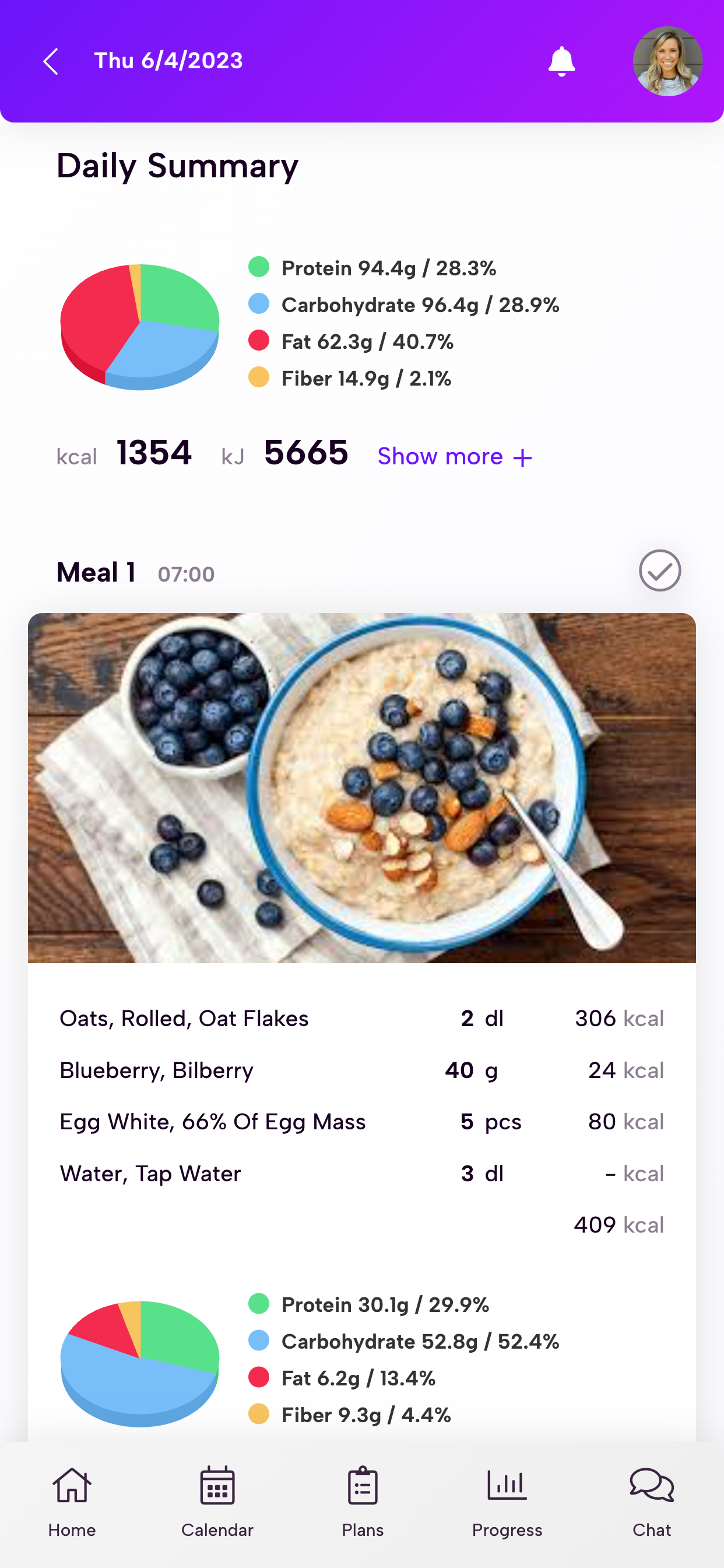 The client gets a clear breakdown of the diet plan's content: Proteins, Carbohydrates, Fats, Fibers, and much more.