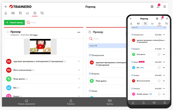 Создавайте комплексные и автоматизированные онлайн-курсы для отдельных клиентов и групп. Они отлично работают вместе с другими функциями, такими как планы тренировок и планы питания.